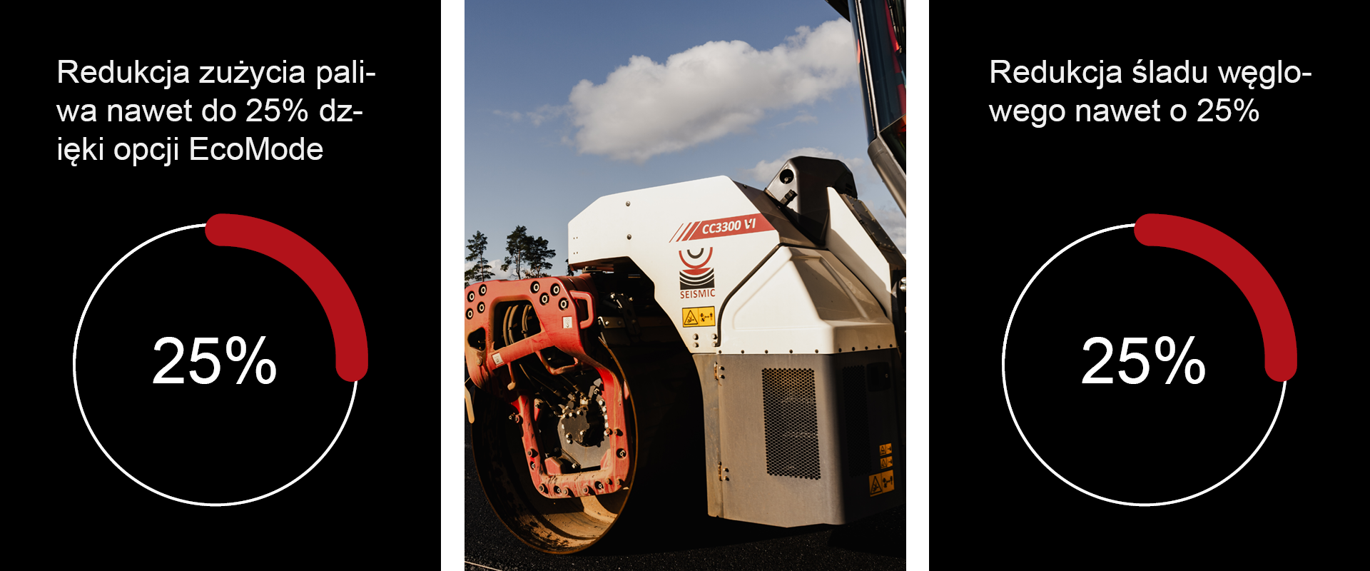 Przy włączonym trybie EcoMode maszyna pracuje przy najniższych możliwych obrotach bez obniżania jakości zagęszczania. Po 10 sekundach pracy bez obciążenia maszyna zredukuje obroty silnika. Ta funkcja nie zakłóca ogólnego przepływu pracy ani działania maszyny i zapewnia natychmiastowe uruchomienie po trybie bezczynności.